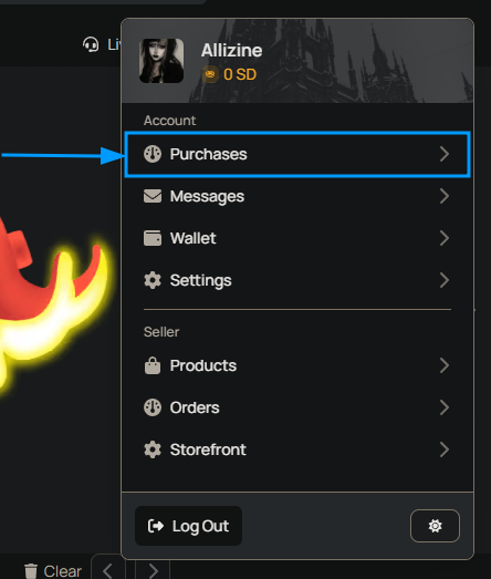 - Navigate to Purchases in the dropdown menu in the top right where your avatar is.