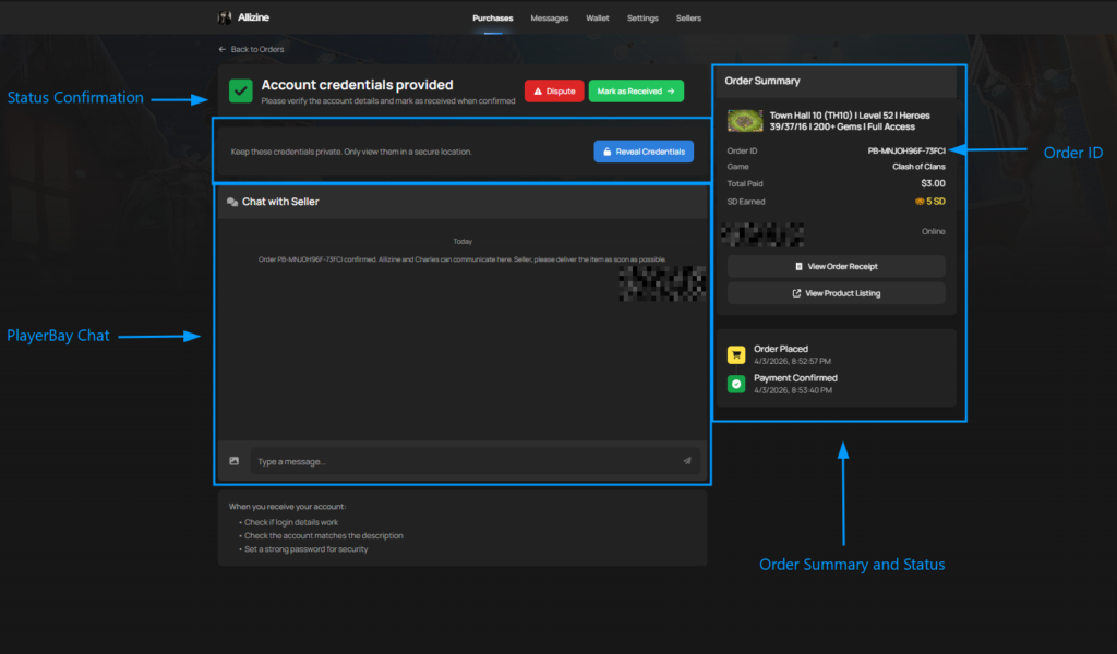 If you purchased an order with the Instant Delivery option, you will see the account details at the top of the order page, otherwise your account details will be manually delivered by the seller in the order chat. Use this image for order page navigation: