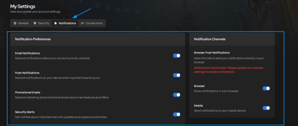 Below is a visual walkthrough on how to enable notifications on the PlayerBay Platform.