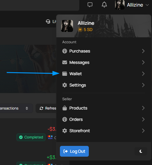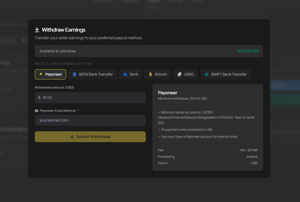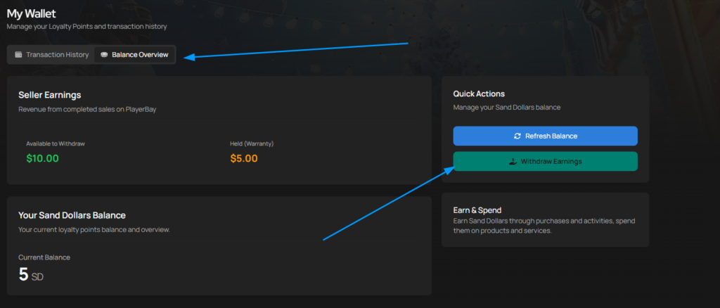 To withdraw your earnings from PlayerBay, head to your wallet page and click the “Withdraw”